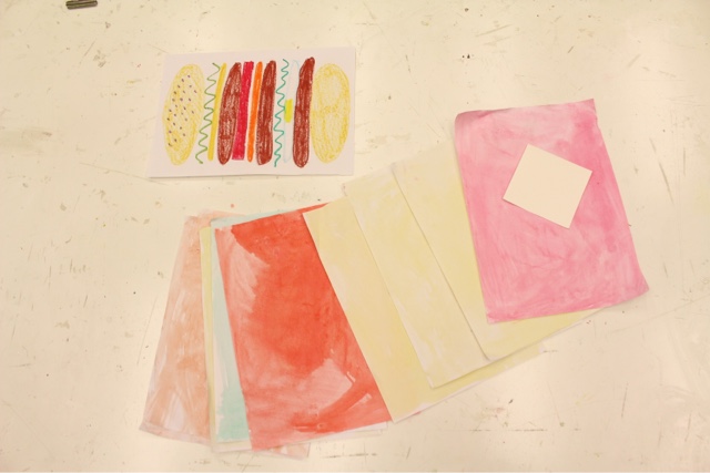 アイス屋さん制作です。アイスはダブルにしてくれました!やっぱりシングルよりずっと豪華です。まだまだ作ってくれるみたいです。焚き火の絵を始めました。火の色が燃える物によって色が変わるお話をしたら、たくさんの色で火を塗ってくれました。