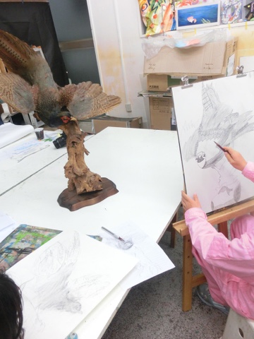 キジの剥製、色味も複雑で、模様も細かく、羽を広げた形もふくざつですが、ああでもないこうでもないと消しては描き消しては描きしていくうちに鳥のふわっとした質感にたどり着いたり、細い模様をじっくり追っていったり、それぞれに進めてくださいました。